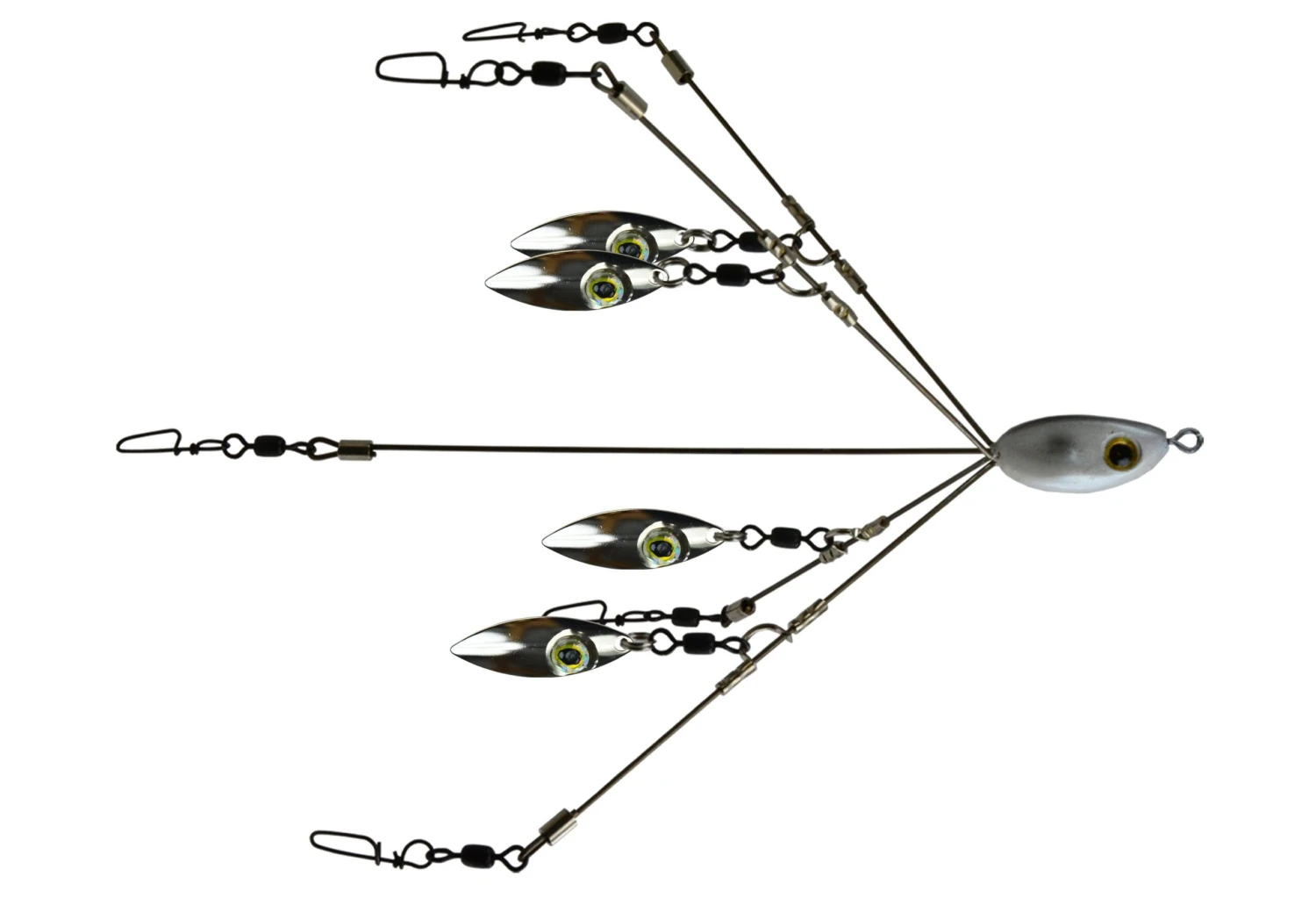 - Equipped with durable lightweight plastic heads, embedded nose swivels to prevent line twist, and perfectly sized blades for reduced drag, flash, and vibration to attract fish while keeping the rig in the strike zone!