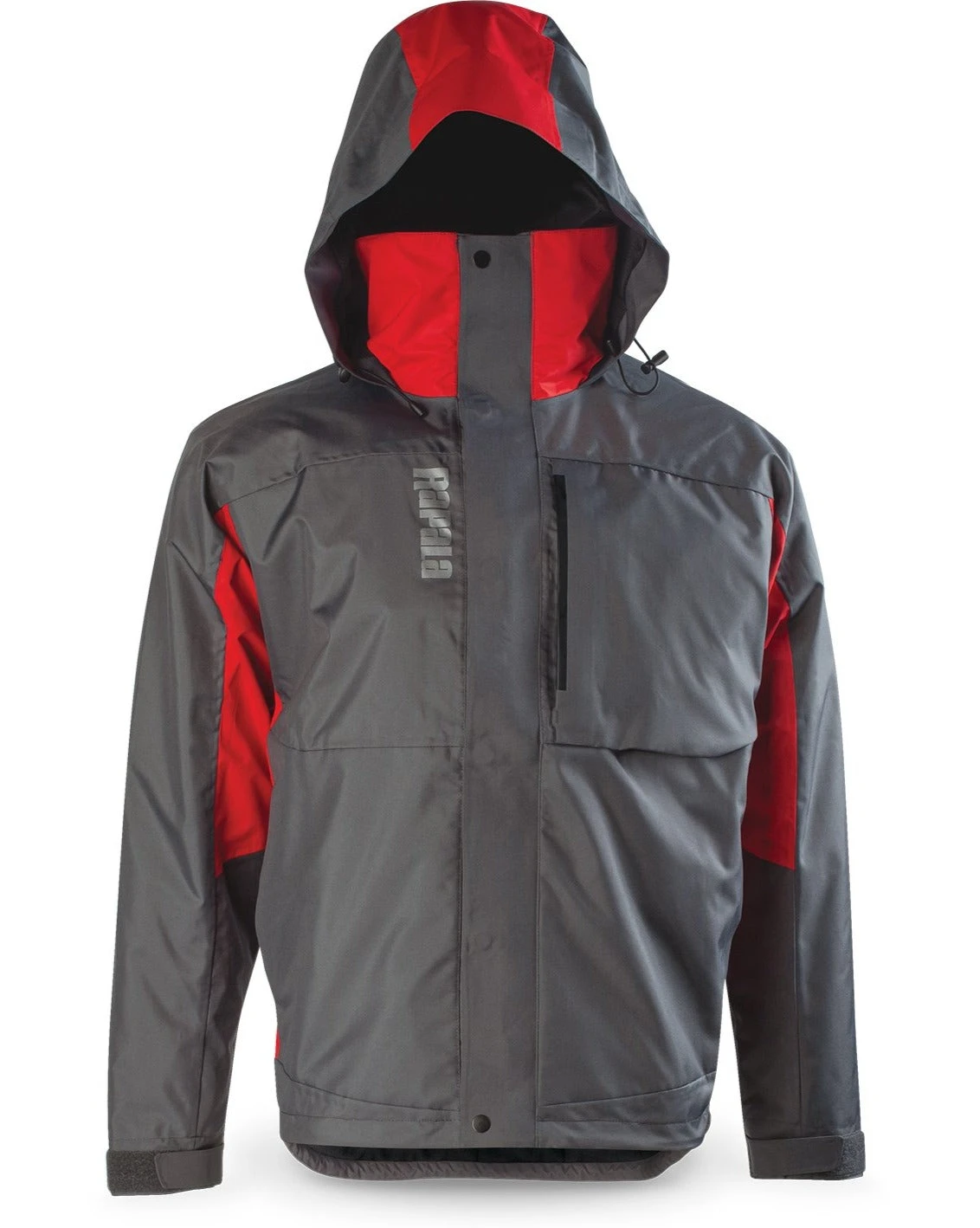 - The Rapala Rain Jacket is a grey and red foul-weather fishing jacket.
